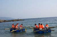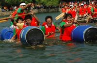 扎筏泅渡是团队合作共创的项目,利用水桶、绳子、毛竹共同扎一个竹筏并能乘坐小组所有成员从A店到达B点并确保无人员落水及竹筏的完整,过程中相互之间可以打水仗、相互泼水